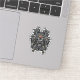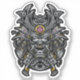 Esta imagen representa una máscara de samurai estilizada, inspirada en la oni, un demonio japonés u ogro. La máscara es principalmente metálica, con detalles complejos y una expresión amenazadora. Los ojos se estrechan y la boca se abre en un gruñido feroz. Una flor de cerezo se exhibe de manera prominente en la frente, añadiendo un toque de contraste y simbolismo. La máscara se enmarca dentro de un diseño circular, enfatizando su potente presencia.