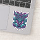 Esta intrincada imagen psicodélica presenta una máscara fiera, parecida a una oni, rodeada por una compleja red de serpientes, cráneos y patrones geométricos. La máscara es predominantemente morada con acentos turquesa, mostrando dientes afilados y ojos penetrantes. Las serpientes, representadas en una paleta de colores similar, se enroscan y giran alrededor de la máscara, con la cabeza formando una corona amenazante. Los cráneos están dispersos por toda la composición, lo que aumenta la sensación general de peligro y poder. El fondo es una mezcla agitada de morado oscuro y turquesa que crea un entorno dinámico y llamativo.