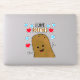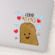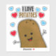 Divertidos y felices papas marrones rodeados de corazones de amor rojos y azules con Amo a las papas con letras negras y marrones encima de su cabeza.