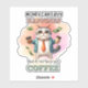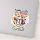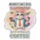 A funny, sarcastic, and colorful design showcases a cat with green eyes and white and gray fur, holding a cup of coffee in each hand. The cat is dressed in a suit jacket with an orange and white striped tie, surrounded by floating dollar bills. The vibrant text reads: "Money can't buy happiness but it can buy you coffee." This design is available on a variety of products, making it a perfect gift for cat lovers.