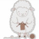 Un adorable mouton blanc tout doux s'adonne au tricot avec ses aiguilles et une pelote de laine marron. Un visuel idéal pour les passionnés de loisirs créatifs, de couture et de cocooning.