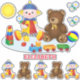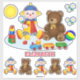 Coloridas muñecas de trapo, ladrillos y pelotas, con sol brillante, flores, osos de peluche y nombre del niño. Juguetes tradicionales listos para alegrar el vivero. Este pegatina está diseñado para ser adquirido en tamaños mayores, eligiendo los tamaños pequeños hará que las imágenes individuales se fusionen en una, por lo que no se pueden eliminar por separado de la parte posterior.