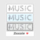 This sticker set features three designed “Music” stickers, each made up of from music notes. Every letter is composed of treble clefs, quarter notes, and other musical symbols, creating a stylish and artistic tribute to the universal language of sound. Perfect for musicians, music lovers, and creatives, these stickers add a harmonious touch to laptops, water bottles, notebooks, or instrument cases.