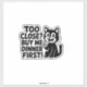 "Sigan riéndose los saqueadores y a una distancia segura con este gracioso ‘¿Muy cerca? ¡Cómprame La Cena Primero!", pegatina de coches. Hecho a partir de vinilo duradero e impermeable, esta calcomanía fácil de aplicar es perfecta para coches, bicicletas, camiones y vehículos todoterreno. Agrega un toque lúdico a tu vehículo mientras das una advertencia descarada. ¡Un regalo ideal para los conductores con sentido del humor!"