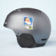 Ilustración vintage de diseño navideño con una cara de Santa Claus flotante sobre un pueblo nevado. Una cinta con estrellas y acebo de Navidad enmarca la escena.
