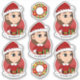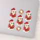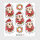 Conjunto de siete pegatinas cortados de vinilo con un ilustracion de un lindo chica sonriente feliz con el pelo largo, vestido con ropa de Navidad y llevando un gorra rojo de Santa Claus, de fondo rojo; cinco pegatinas del chica y dos pegatinas con una corona de cerveza de barril; con una plantilla de texto para cada nombre o mensaje