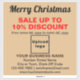 Feliz Navidad! Una de las fiestas más celebradas del año. También es una de las mejores temporadas para promocionar su negocio o promocionar su marca a clientes o clientes. Personalizable pegatina vinílico cuadrado con Navidades Venta, su nombre comercial y otra información. Pegatina de vinilo que puede utilizar como material de marketing para atraer a más clientes. Personalizar y muéstralo para convencer a más clientes de que compren sus productos o clientes para que les gusten sus servicios. Pegatina para diciembre o Navidades en julio. Los colores de diseño son textos negros, marrones oscuros y rojos sobre fondo marrón claro. Los contenidos son Feliz saludo de Navidad, venta de textos con un porcentaje de descuento que ofrecerás, fechas de venta, nombre de negocio, logotipo, dirección, número de teléfono, correo electrónico y sitio web o página de tu empresa en las redes sociales. Compruebe la apariencia después de cargar el logotipo y escribir textos. Si la apariencia le resulta agradable, puede realizar su pedido ahora. Si necesita cambiar el tamaño y mover el logotipo y los textos para que encajen en este pegatina o en el tamaño que elija, por favor cambie la herramienta de diseño. También puede cambiar el color de fondo, el color de fuente y el estilo de fuente en la herramienta de diseño. Feliz Navidad! Te deseo más ventas esta fiesta.