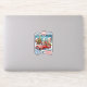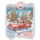 Un alegre camión rojo cargado de regalos coloridos conduce a través de un pueblo nevado adornado con decoraciones festivas. Los árboles verdes brillan en el paisaje, mientras que las casas con encanto crean un ambiente cálido de vacaciones. Los juguetones sellos de Santa añaden alegría.