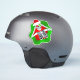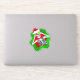 Este pegatina de vinilo tiene un esqueleto de Navidades que sostiene dos ornamentos con copos de nieve hasta los ojos que llevan un gorra de Santa Claus recortado de piel que asoma a un portal abstracto rojo brillante y verde.