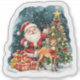 Una pegatina de Navidad caprichosa muestra a un alegre Papá Noel parado al lado de un reno alegre. Rodeada de regalos envueltos de colores brillantes y de un bello árbol adornado, la escena captura la magia de la temporada de vacaciones, irradiando alegría y alegría.