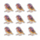 Un llamativo ilustracion de neón de un gorrión adornado con anillos brillantes y acentos vibrantes, ambientado en un audaz fondo inspirado en la onda sintética de púrpura, azul y rosa. Esta obra de arte retro-futurista de aves es perfecta para los aficionados a la estética de vaporwave, el arte digital brillante y los retratos surrealistas de animales.
