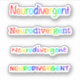 La palabra "NEURODIVERGENT" escrita cuatro veces en colores arcoiris y fuentes diferentes. El diseño de este paquete de pegatinas tipográficos tiene como objetivo promover la neurodiversidad. ¡Acepten la neurodiversidad y amen las mentes de todo tipo con estos pegatinas de la neurodiversidad de color arcoiris!