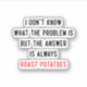 No sé cuál es el problema, pero la respuesta es siempre patatas asadas" el diseño combina humor, tipografía minimalista y una cita graciosa. Perfecto para los que aman los dichos ingeniosos y el humor atemporal.