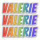 Este fascinante diseño pegatina multicolor y vibrante presenta el nombre común de "VALERIE", con las letras del nombre que presentan un colorido espectro arcoiris como el patrón de color gradiente. Puede ser un regalo divertido para alguien cuyo nombre se llama Valerie. [~Z0000361]