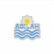 Texto azul Asilah Marruecos, Olas azules, Sol Naranja/Amarillo.