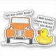 Humorvoller Dialog einer 2cv Ente mit einer Gummiente. In den Farben Schwarz, Orange, Gelb.