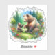 Un oso mami jugando con su bebe oso afuera en un campo de hierba y flores con un fondo de pino. Estilo acuarela ai art.