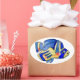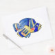 Aquí hay un lindo y sonriente pez mariposa azul sobre un pegatina oval. Con manchas rojas naranjas brillantes y dos tonos azules con oro, es un diseño personalizado de la mariposa de mapache que se encuentra en los arrecifes tropicales de islas como Hawaii o Tahití. Personalice este pegatina para crear su propio mensaje, para una etiqueta o etiqueta de regalo.