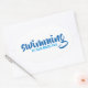 La palabra "natación" está escrita en un divertido texto tipográfico azul con los estilos de natación de mosca, espalda, pecho y libre escrito debajo en un texto azul más claro.