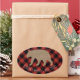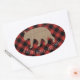 Un pegatina con un ilustracion de silueta de oso burlap. El texto debajo dice, "BEARY MERRY CHRISTMAS" El fondo es rojo y negro lumberjack chapa de búfala plaid.