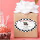 Ilustracion de un búfalo con un sombrero de santa con un árbol de Navidad cubierto de nieve atado a su espalda. El borde es un patrón de manto de búfalo blanco y negro.