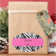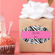 Patrón de cebra en blanco y negro con acento rosa caliente. Rayas blancas imitando cebra en un fondo negro. El diseño incluye una huella de cebra en blanco y negro y una banda rosa en el centro.