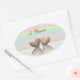 Pegatina ovalada con mi diseño original simple de dos corazones de madera flotando en el agua bajo un arcoíris. El texto dice "5 Años" y se puede cambiar.