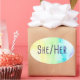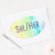 La acuarela arcoiris con divertido texto morado oscuro ayuda a la gente a conocer tus pronombres! ¡También un gran regalo para los amigos cuyos pronombres son ella / ella! ¡Rompamos el binario de género, un pegatina a la vez!