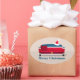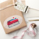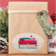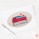 Un pegatina navideño con un sofá vestido de Santa Claus. Las palabras están en azul y son personalizable. Navidades de Santa Couch Holiday Oval Pegatina Diseño de vacaciones | ©Melissa Patton - Artista/Ilustrador