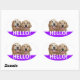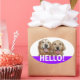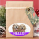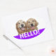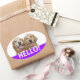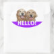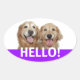 ¡Saluda! Estos pegatinas muestran una fotografía de dos sonrientes perros recuperadores de oro, con la palabra ¡HOLA! en blanco sobre un fondo morado. ¡personalizable total! Añadir texto, si lo desea.