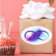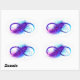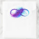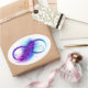 Símbolo infinito con una hermosa pluma pintada de color violeta y azul brillante sobre fondo blanco.