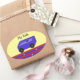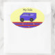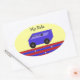 Un pequeño y fresco vagón azul con un mango negro y ruedas. Un fondo amarillo y un borde de rayas rojas y azules con pequeñas estrellas amarillas.