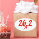 Maratón rojo 26.2 con símbolo de punto en marcha.