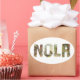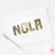 Este pegatina presenta cuatro escenas vintage de postal de Nueva Orleans dentro de cada carta de NOLA.