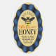 Borde moderno de cinta azul sobre un fondo dorado con una abeja en el centro para crear tus propios y elegantes pegatinas de tarro de miel. Personalizar el texto con el nombre de marca de su negocio de apicultura, información de contacto, tipo de miel, peso y fecha, Diseñado para recipientes ovalados y queenline de tarro de miel, botellas de apretón invertido y tarros de albañilería de arte.