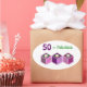 Un diseño divertido con cubos 3D en tonos violeta y flores blancas encima. Cincuenta es fabuloso. El dicho puede cambiarse si así lo desea.
