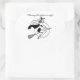 Vintage dibujo en blanco y negro de una bruja en su bastón de escoba diciendo "¿Quién dice que todas las brujas son feas?"