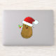 Navidades felices Papa vistiendo un sombrero rojo de Santa con un guarnecido de piel blanca y un títere blanco esponjoso. Su cuerpo es marrón con pequeños puntos negros para los ojos y una gran sonrisa feliz. Tiene palos para los brazos y está sosteniendo hojas verdes con bayas rojas.