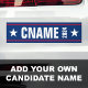 Pegatina con el nombre de tu candidato personalizado y año. Texto blanco flanqueado por estrellas sobre un fondo azul con franjas rojas arriba y abajo. Rellena el nombre de tu candidato político favorito.
