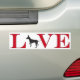 Un divertido bumpersticker para los amantes de Chihuahua con la palabra amor en letras rojas de gran bloque y una silueta de un Chihuahua reemplazando a la O.