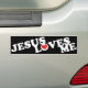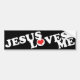 Jesús Me Ama La Sticker Para Los Cristianos. Fondo negro, con texto blanco para un efecto negrita. El corazón rojo en el "o" de los amores.