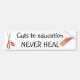 La pegatina para el parachoques blanca que lee los cortes a la educación NUNCA CURA. Ofrece la imagen de un vendaje bandaid y de un par de tijeras manejado anaranjado.