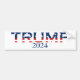 Esta pegatina de parachoques patriótica de la campaña presidencial Donald Trump 2024 muestra el nombre "Trump" impreso en un patrón de bandera estadounidense en todo el centro. Las estrellas se imprimen en la mitad superior del texto, y las rayas en la parte inferior. El año electoral "2024" está impreso debajo en una fuente azul marino.