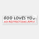 El texto simple dice que Dios te ama; no se aplican restricciones. ¡Sabemos que lo hace! Texto en negro y rojo sobre borde blanco y gris.