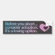 Me movieron para crear a esta pegatina para el parachoques después de que dos de mis mejores amigos tuvieran abortos. Cuando les pregunté porqué no eligieron la adopción, ambos respondieron que apenas no la consideraban como opción. Mi pensamiento era introducir el pensamiento alguien antes de que se hagan frente con un embarazo indeseado.