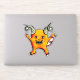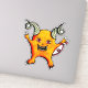 Pegatina de demonio mate con un dibujo de tinta de una criatura amarilla rara con cuernos sonriendo alegremente y mostrando sus dientes afilados.