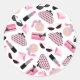 Un pegatina con un diseño compuesto por gafas de sol de ojos de gato rosa y negro retro, bolsos de cambio rosa con puntos de polka gris, bolsos de embrague rosado con arco negro, lápiz labial rosa, piedras preciosas rosadas y botella de perfume con atomizador rosa.