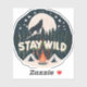 Un lobo de silueta grita contra una luna llena, rodeado por un bosque y una fogata entre dos tiendas. Las palabras "Stay Wild" se exhiben de manera destacada, enfatizando un sentido de aventura y naturaleza.