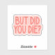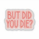 “¿Pero Moriste?” Pegatina de Enfermera – Un guiño descarado a la dureza de los héroes de la salud. Perfecto para enfermeras, paramédicos y profesionales de EMS que lo han visto todo. Pégalo en tu botella de agua, portátil o en la sujeción de tu placa para compartir ese humor característico de la vida de enfermería. Un gran regalo para los temerarios socorristas y salvavidas en tu equipo.