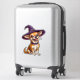 Ilustracion de un perro feliz adornado con el gorra de una bruja, que simboliza la alegría, la magia y el juego. Perfecto para temas relacionados con Halloween, mascotas y arte creativo.